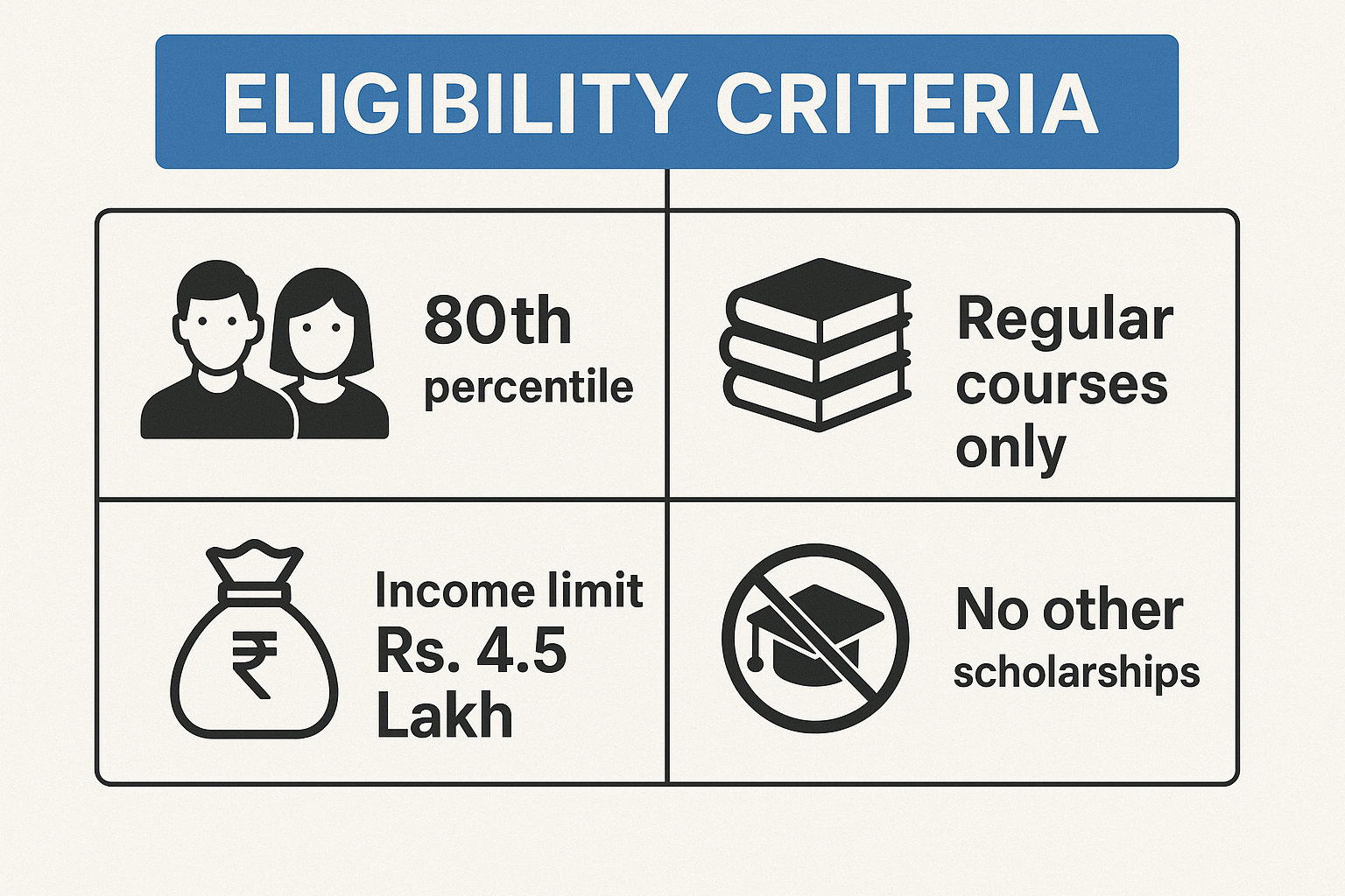 Students who scored above the 80th percentile in Class 12 board exams, belong to families with an annual income of up to ₹4.5 lakh, and are pursuing a regular (non-distance) undergraduate course can apply. Applicants must not be receiving any other scholarship or fee reimbursement. Diploma holders and students who took a gap after 12th are not eligible.
